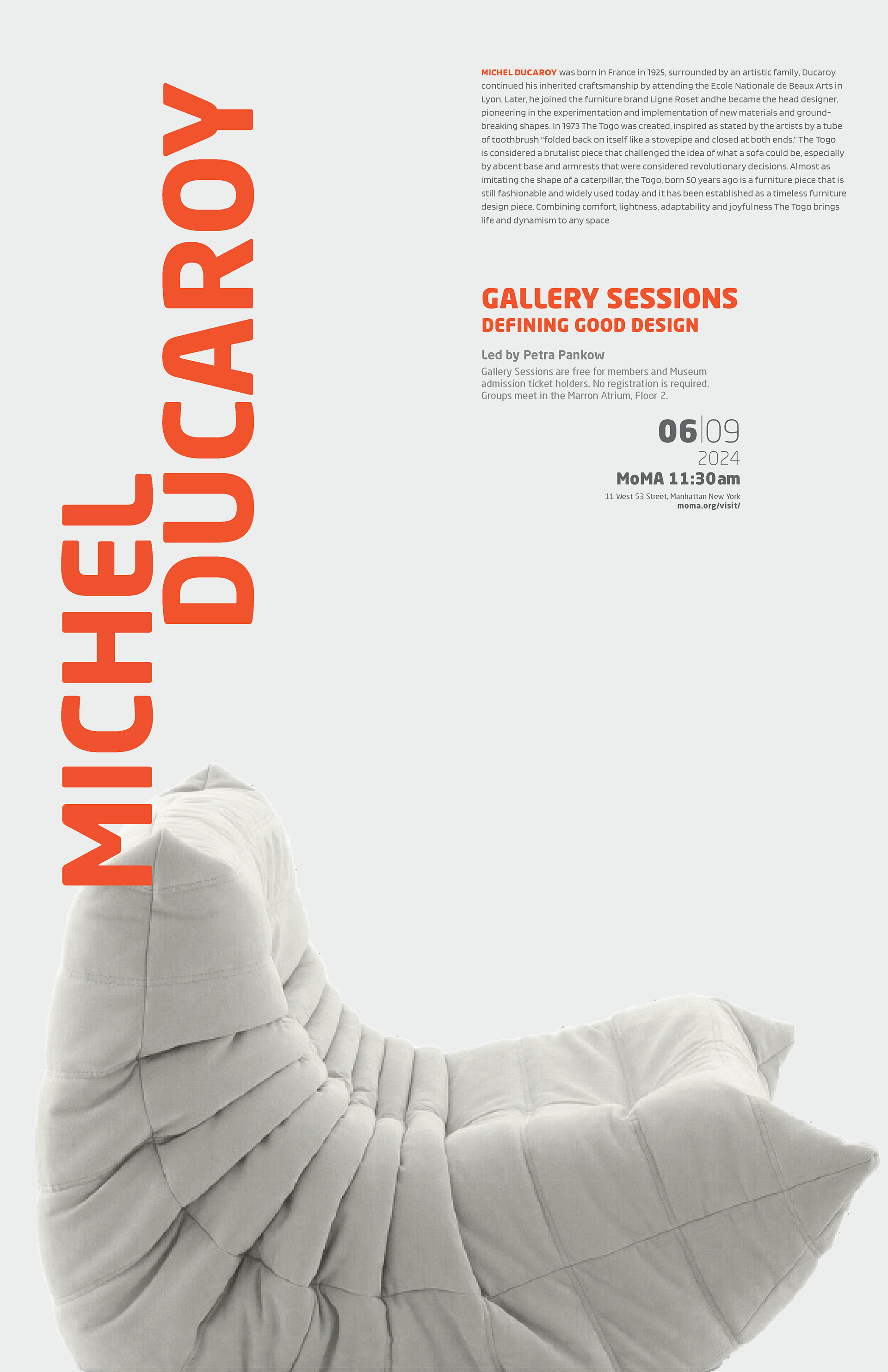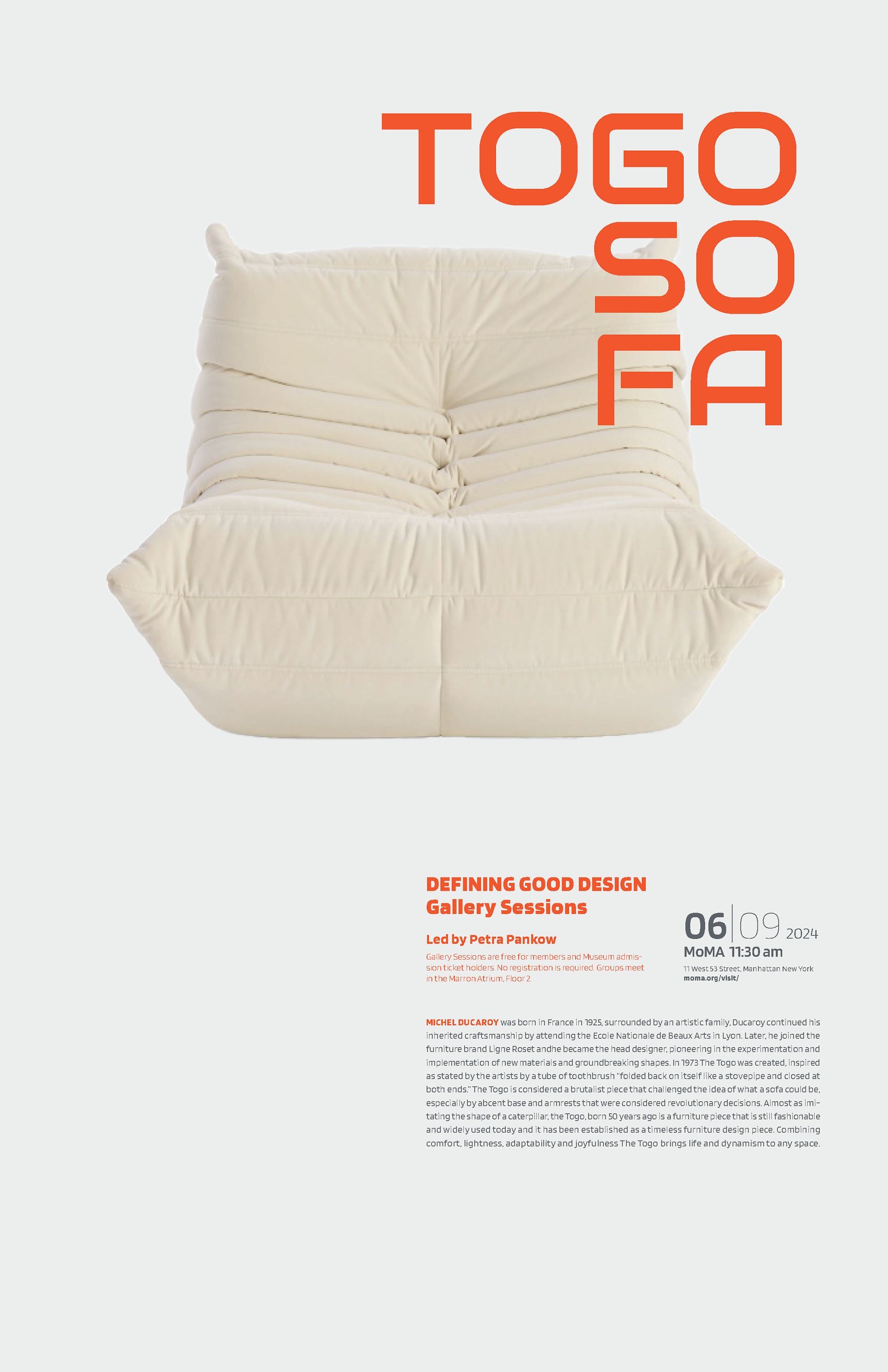Poster that features a talk about the life and career of Michel Ducaroy and his iconic design The Togo Sofa . The design focuses on the relation between type and form, that conveys the journey of this iconic furniture design.